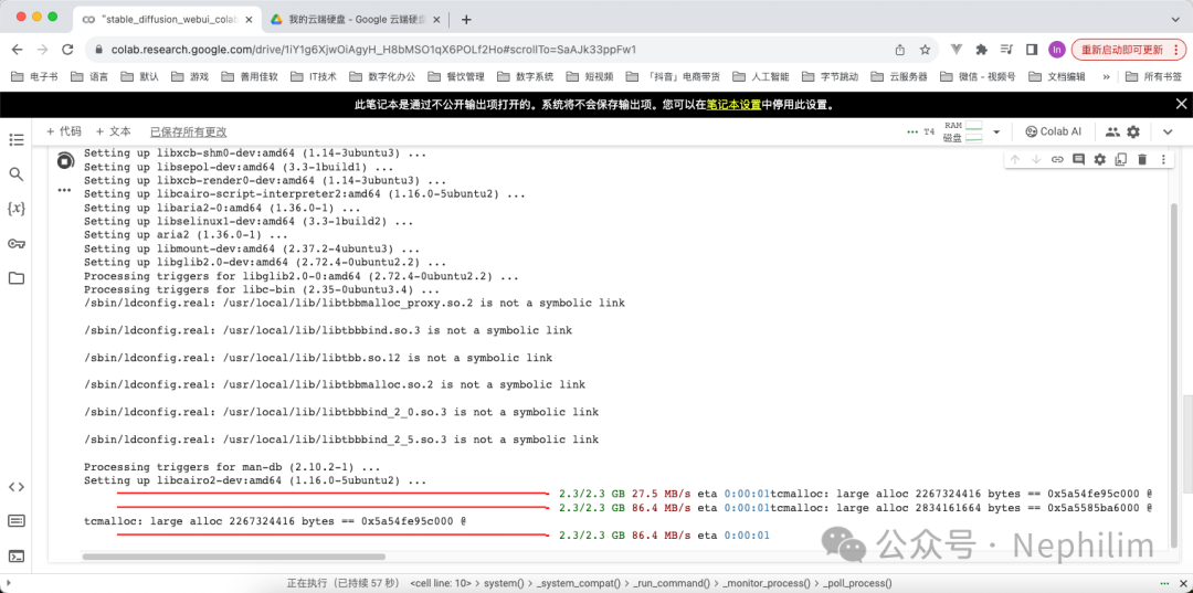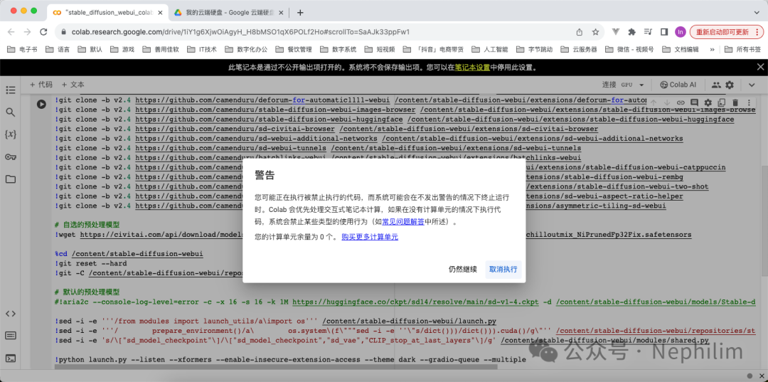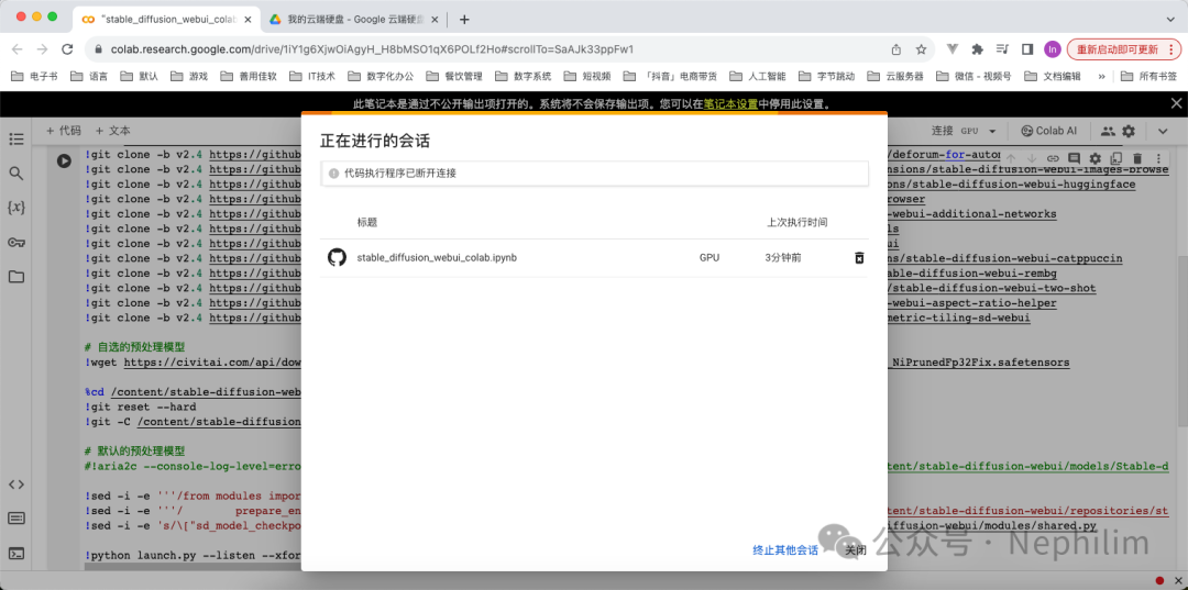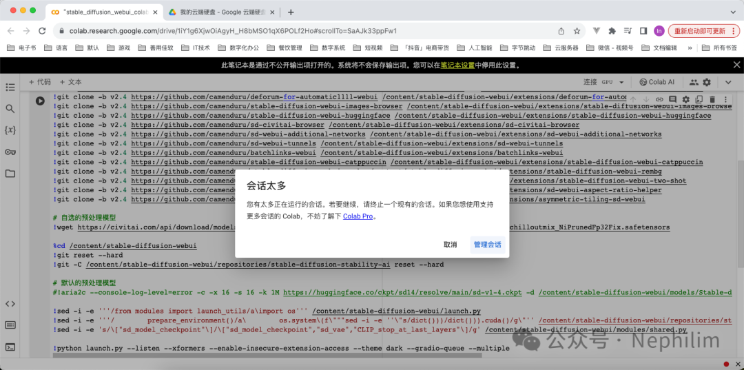 但是需要注意的是,在上面你使用的是一个免费的Google Colab,通常一个会话的时间限制为「12小时」,也就是说12小时后,Google会将分配给你的运行时的资源回收,你的这个SD就无法访问了,连带的生成出来的图片等也会被一起清空;