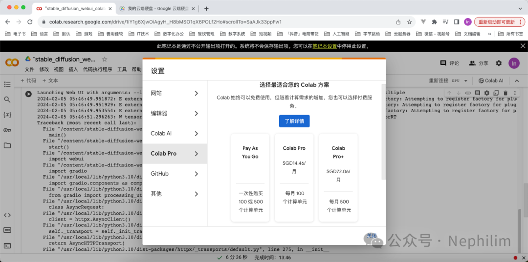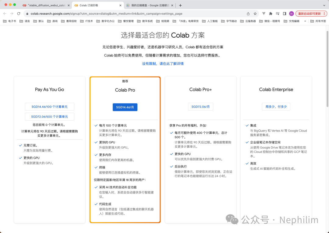 另外,如果觉得免费版本的Colab运行速度与出图效率还是太低了,Google也是支持付费的,你可以购买Colab的计算体: