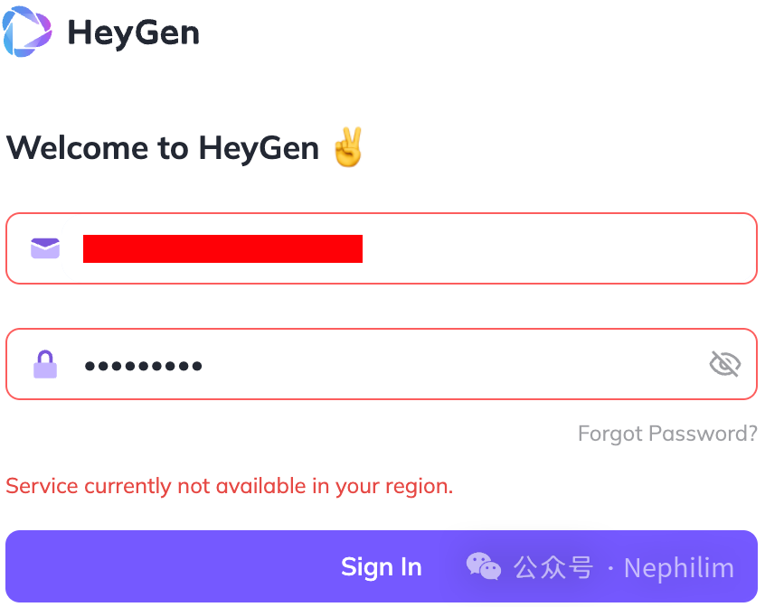 该错误的原因是因为你所在的区域,或者你访问HeyGen的时候的代理服务器所在的区域,不被允许登录HeyGen;