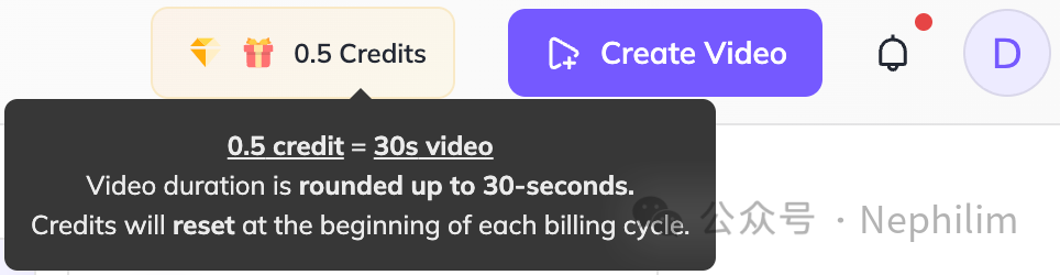 0.5 credit:可以创建一个大约30秒长度左右的视频