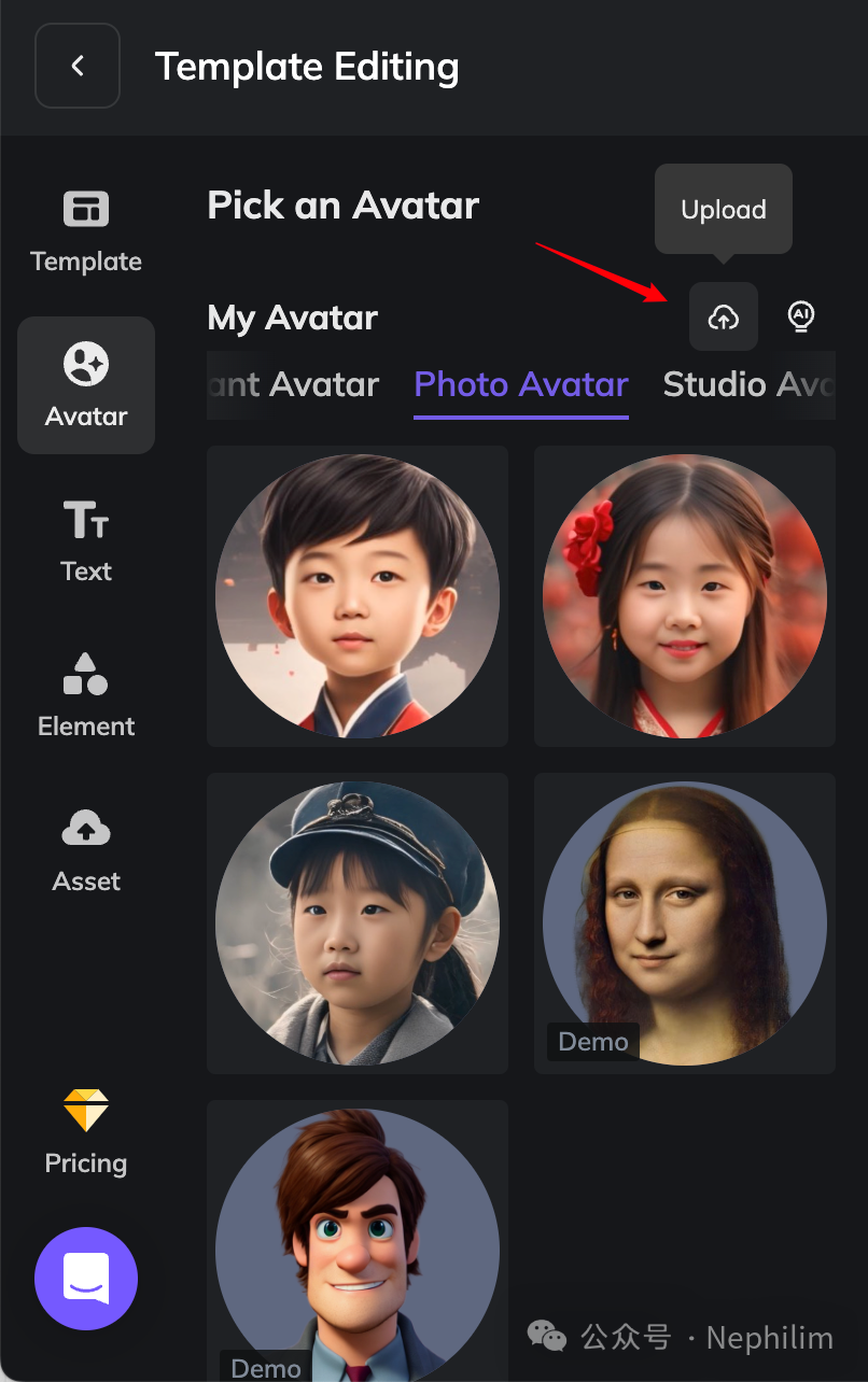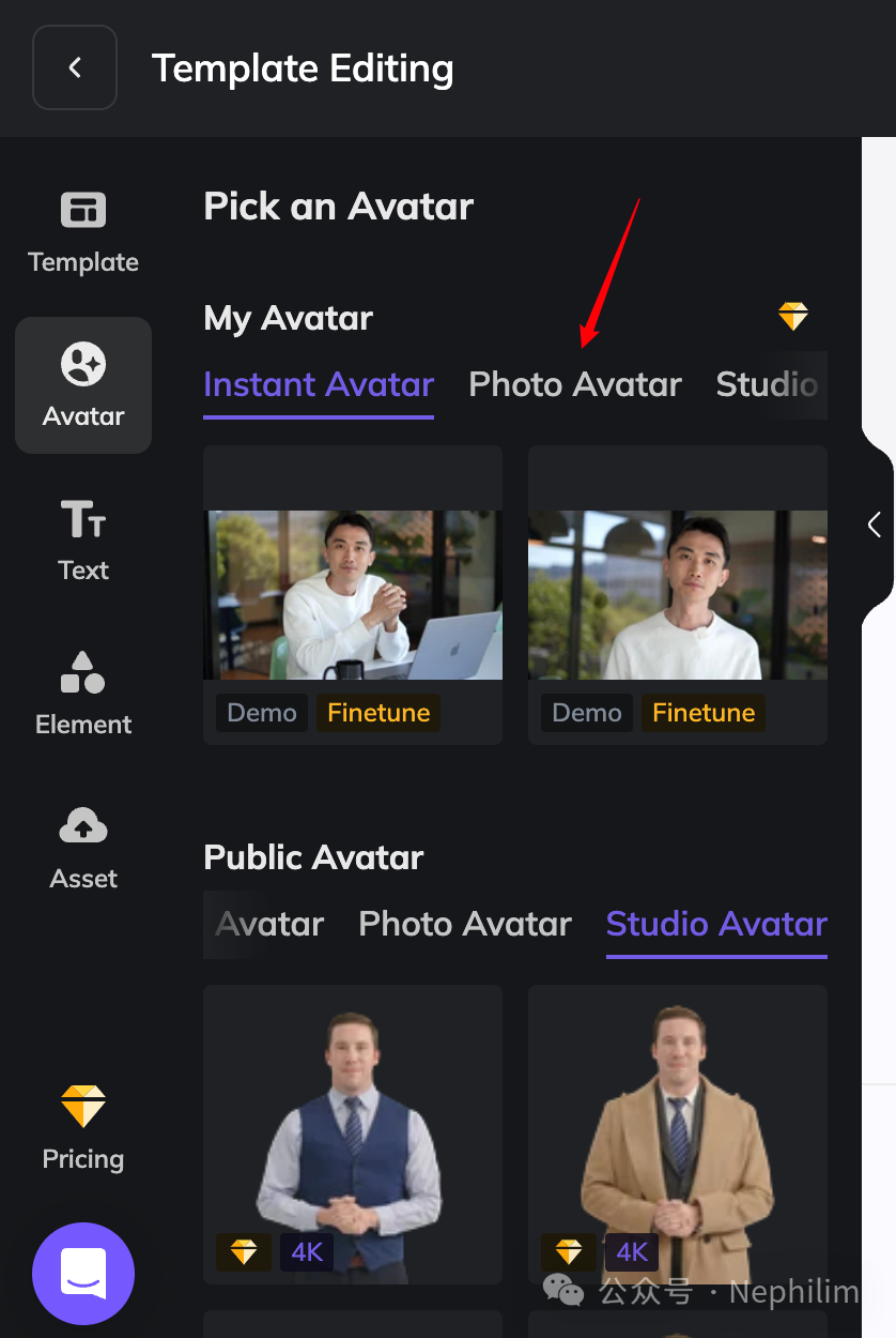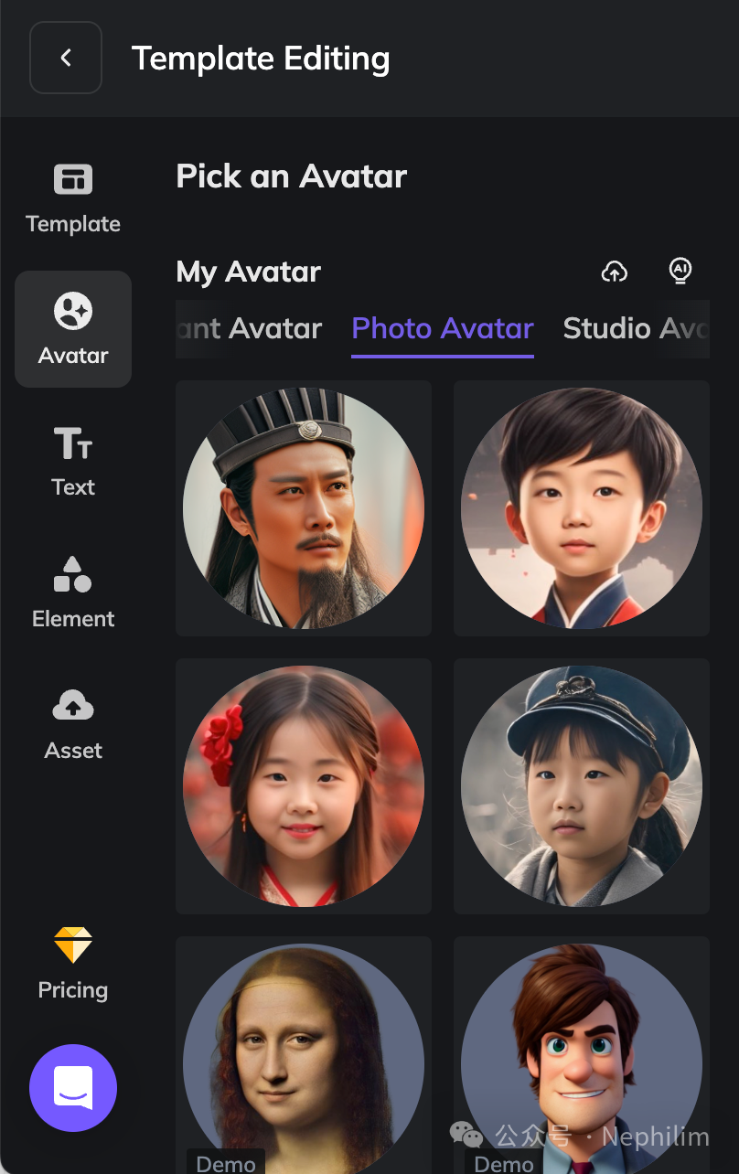 然后,在左侧「Avatar」中选择「Photo Avatar」