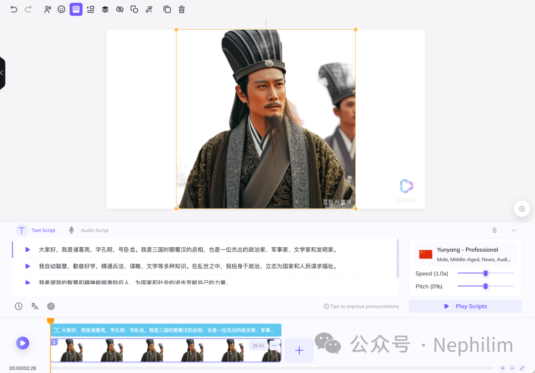 可以看到,随着口播脚本的长度变长,下面时间轴的长度也被相对应的拉长了。