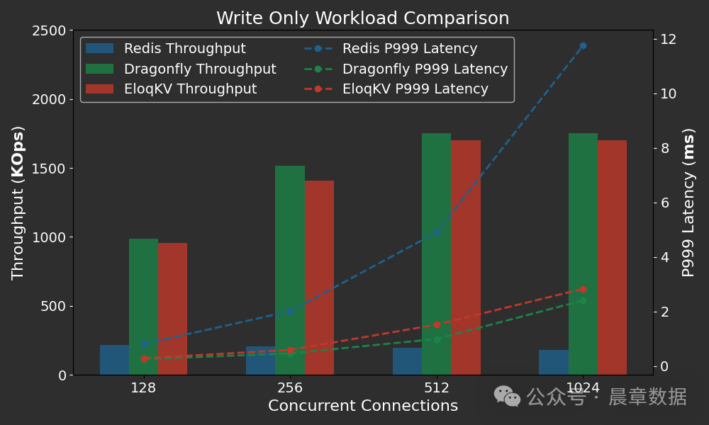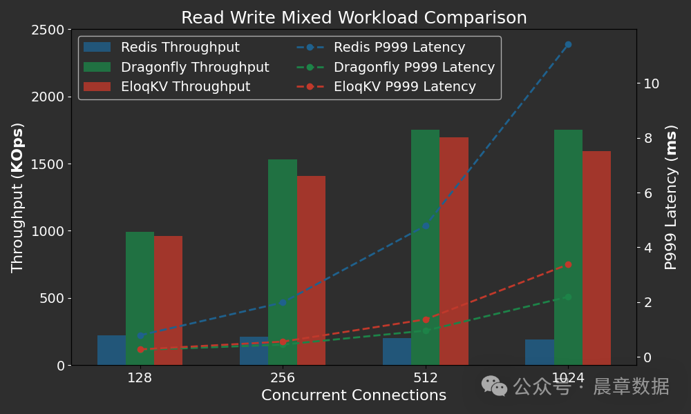 晨章KV的吞吐量与DragonflyDB相似。随着并发性增加,晨章KV的P999延迟略高于DragonflyDB,但即使在超过一千个并发连接的情况下,延迟仍保持在4毫秒以下。
