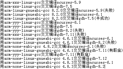 arm-none-linux-gnueabi-gcc 4.8.3幺蛾子最少,可以处理此刻最新的gdb-8.2,不需要动任何其他手脚就可以顺利编译完成。