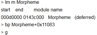 cdb -noinh -snul -hd -o -g -G -xi ld -xe cpr -c "bu Morpheme+0x19cd \"eb @ebp+0x9c 0;gc\";g" install_flash_player_ax.exe