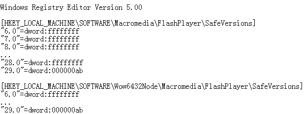 reg add "HKLM\SOFTWARE\Macromedia\FlashPlayer\SafeVersions" /v "29.0" /t REG_DWORD /d 140 /f