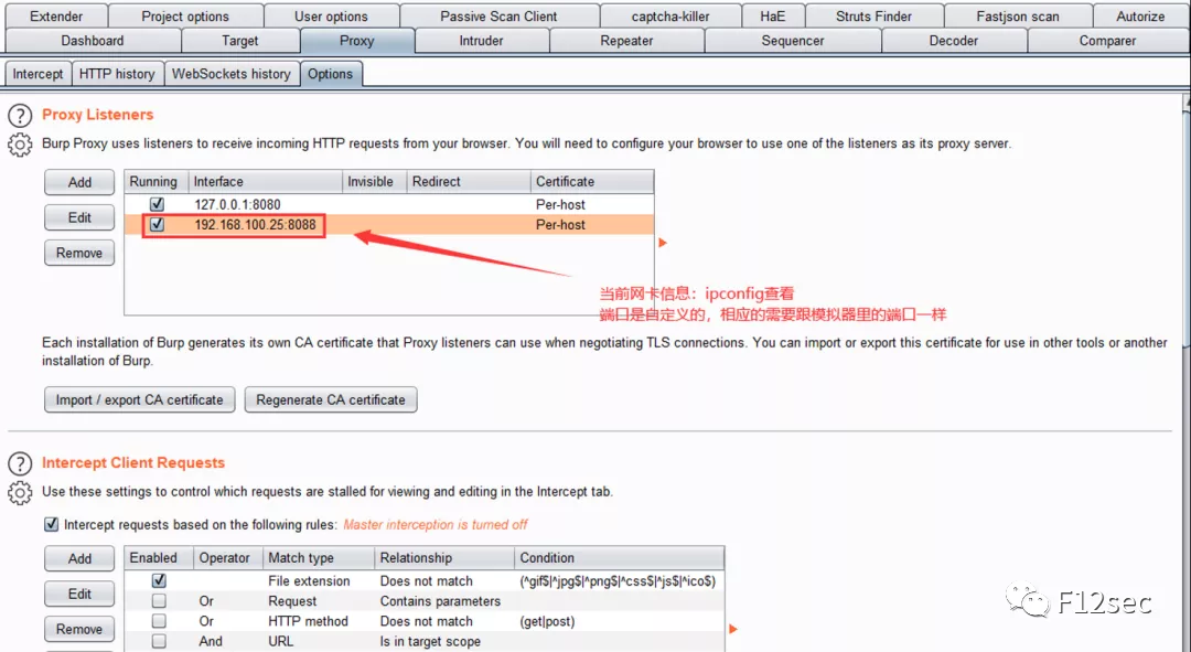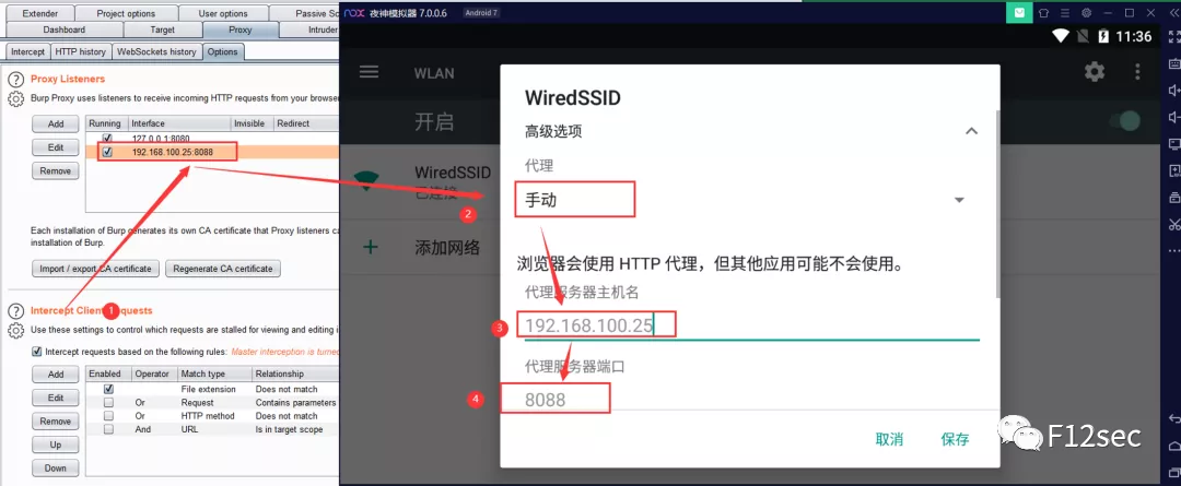1、安装burp证书,burp设置好代理(ps:设置的IP和端口要与真机的一致)。