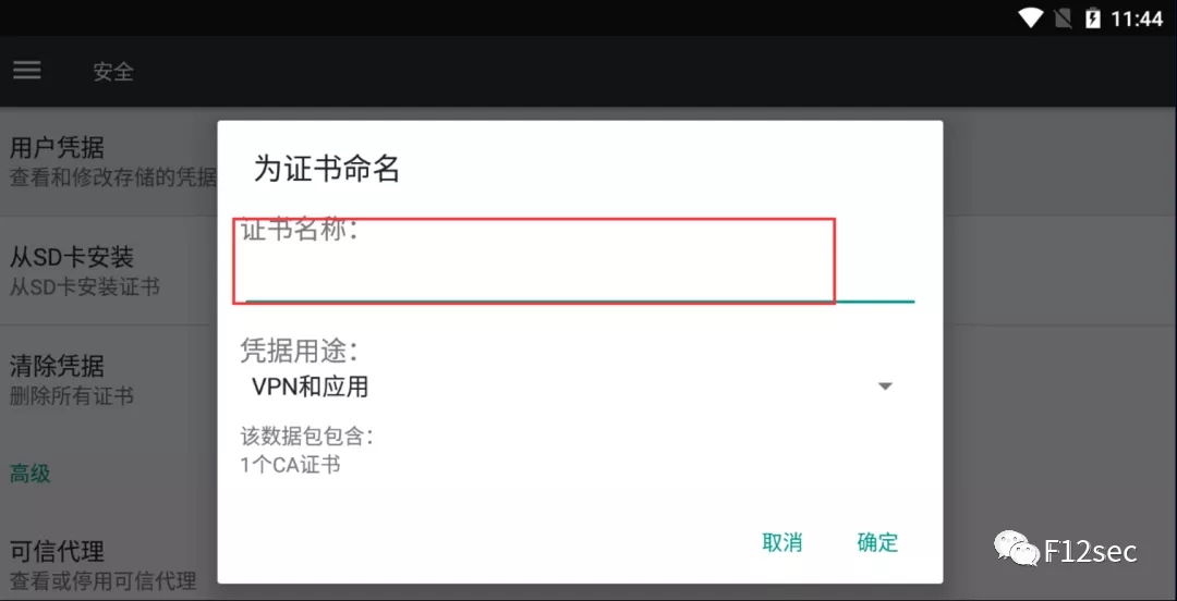 设置->安全->SD卡安装证书,找到对应的证书。