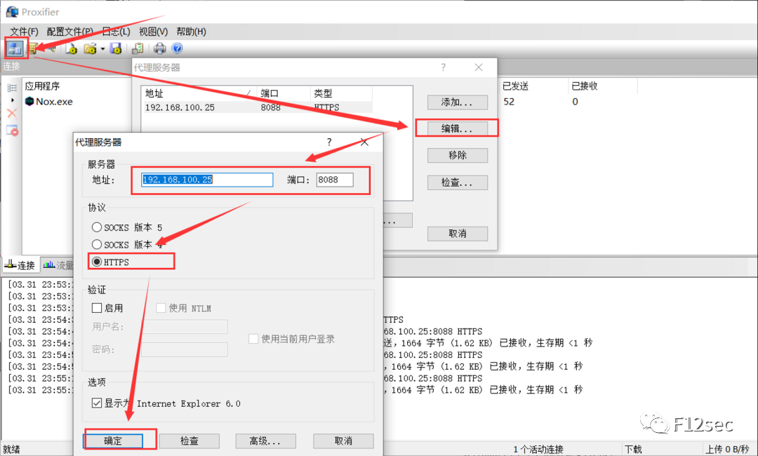 方法二:(在安装有证书的前提下才可使用,没有安装证书的回头看方法一):Proxifier+burp