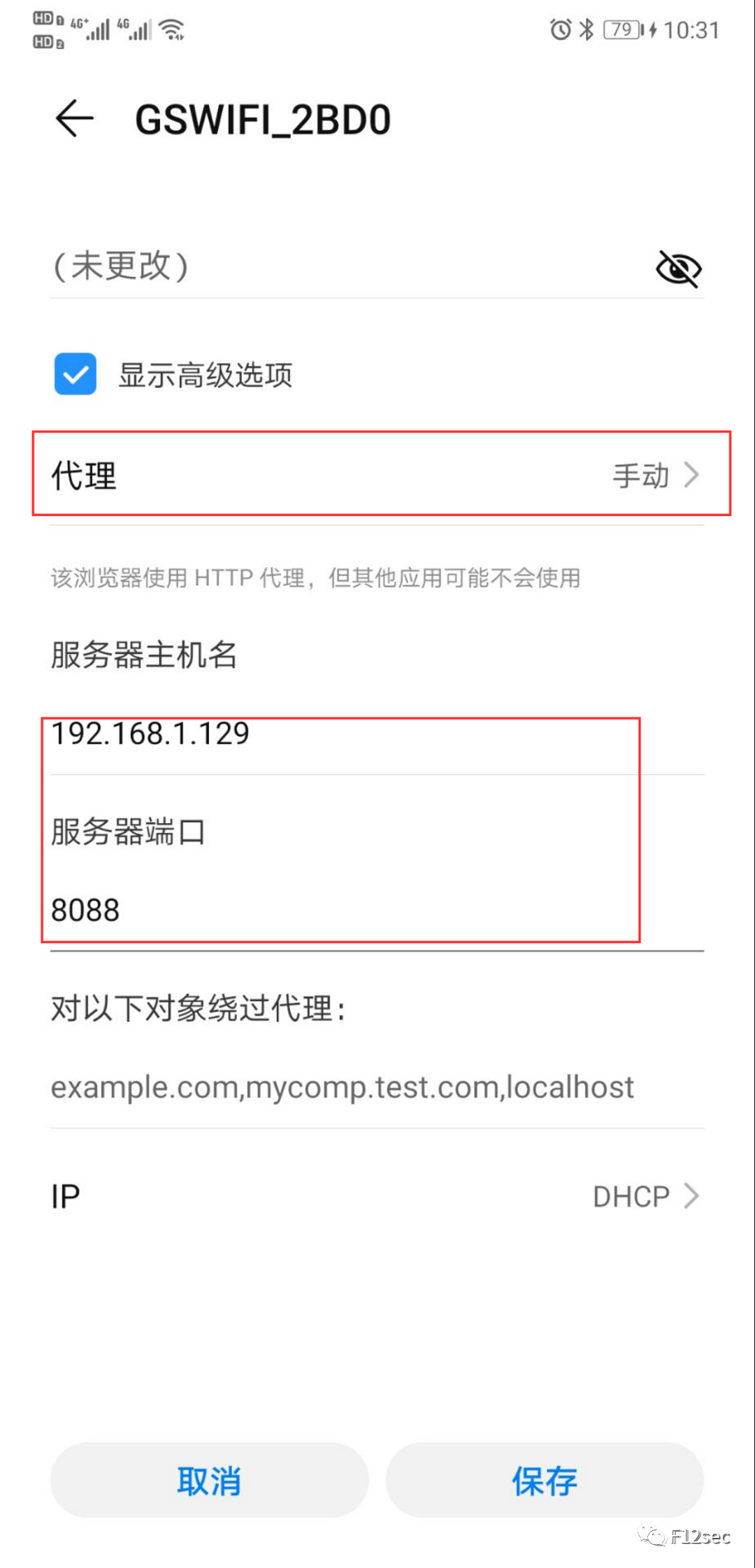 来到真机(本人的P20如下图)—>设置—>WALN—修改网络—>手动,如下图:主机名和端口与burp一致。