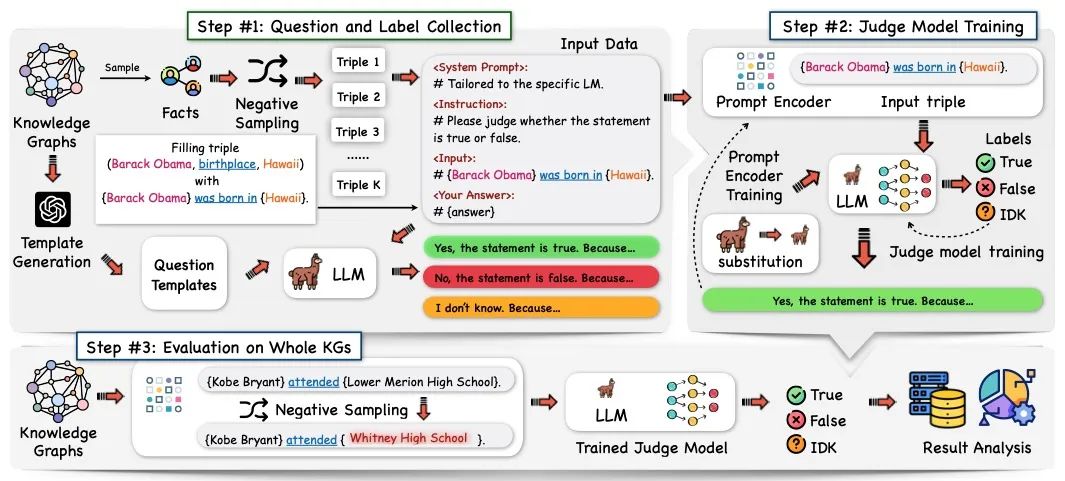 与一些知识探测类工作类似,该方法从知识图谱中采样一部分三元组,通过模版转化为 statement,让大模型判断 statement 是否为真。考虑到开销问题,作者训练了一个评价模型(小模型)来模拟大模型对该 statement 的响应。评价模型以大模型的隐藏层为输入来预测 statement 的正确性,这样便同时解决了上文提到的开销与偏差问题,并且能轻易地扩展到更大规模的知识图上。