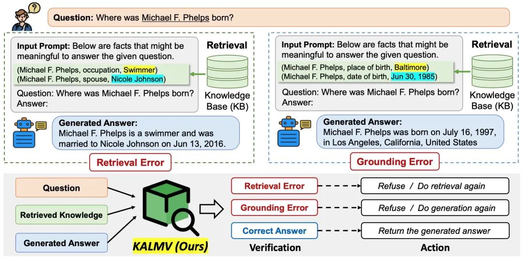 KALMV 主要关注 RAG 过程中的幻觉。在这个工作中,作者主要探讨了两种类型的幻觉:第一种是模型可能无法检索到与给定查询相关的知识,而第二种是模型可能不能在生成的文本中忠实地反映检索到的知识。作者设置了一个分类任务,并训练了一个独立的验证器来基于给出的问题、检索到的知识检测已生成的答案中出现的幻觉。分类的错误标签为 retrieval error(检索到的内容不符合意图)、grounding error(生成的内容没有基于知识)、correct,对应的操作为重检索、重生成与答案返回。