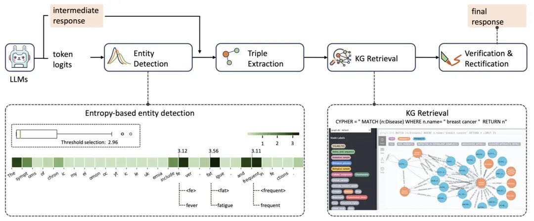 Re-KGR 聚焦于减少医学领域的检索工作量。相比上一工作,该方法采取了类似的方法定位生成响应中的高不确定性实体。进一步地,Re-KGR 提示大模型提取响应中包含的三元组,并重点探索包含上述实体的响应三元组中的幻觉现象。作者选用知识图谱作为可靠知识源,利用这些三元组中实体、谓词以及它们的同义词在知识图谱中搜索背景三元组。这些背景知识将用于校验与修改原始响应。当某个响应三元组与另一个背景三元组具有超过阈值且最高的 spaCy 相似度时,作者替换原始响应中的文本,并采用语法纠正模型来维持完整的输出。