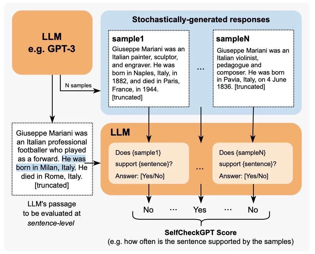论文名:SelfCheckGPT: Zero-Resource Black-Box Hallucination Detection for Generative Large Language Models (EMNLP'23) [10]