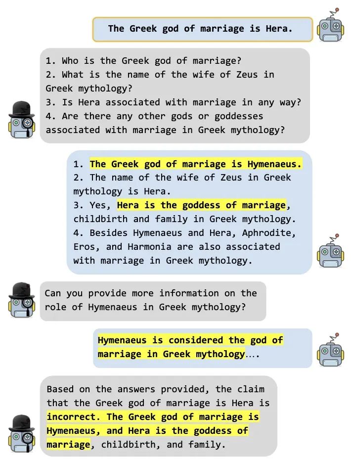 除了对单个模型采样的多个回复进行一致性验证外,也可以采用交叉检验机制来检测大模型生成内容中的幻觉。这项工作的目标是让一名基于大模型的 examiner 来评估另一个基于大模型的 examinee 提出的声明。在每一步中,examiner 提出问题,以找出与 examinee 最初的声明不一致的地方,而不一致现象可被视为 examinee 在其原始声明中的不确定性。这种多轮的问询一直持续到没有进一步的问题并且可以提供最终回答为止。此时的 examiner 将根据多个轮次的交互判断是否存在幻觉。