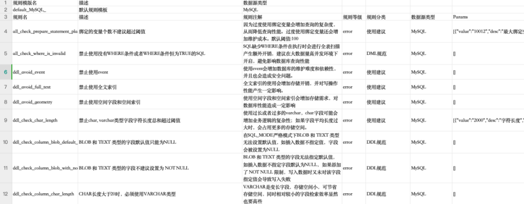 当使用者需要对比不同数据源或环境中的审核规则模板差异时,可以将审核规则模板导出为 CSV 格式,随后在 Excel 中直观地查看和比较模板差异,快速识别需要调整的地方。