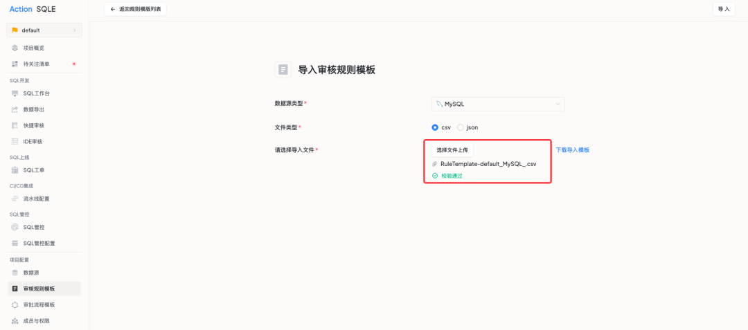 此外,当需要将一个项目的审核规则模板迁移/复用到另一个项目时,使用者可以轻松导出规则模板,并在目标环境中进行导入,确保规则的一致性和准确性。