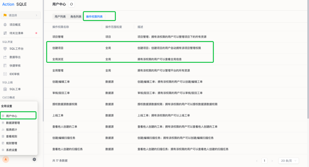 管理员可以在用户中心配置用户拥有的全局操作权限。