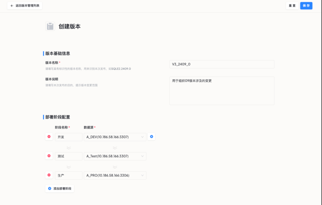 2. 配置版本涉及的发布阶段及应用的数据源。