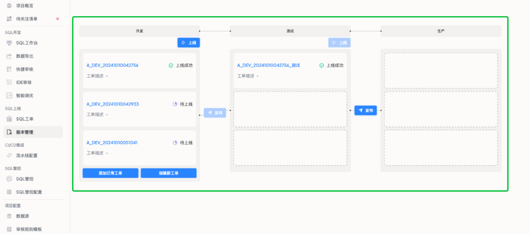 3. 创建完成后,可以在版本详情中管理版本涉及的工单变更,并逐步完成在不同环境的上线验证工作。