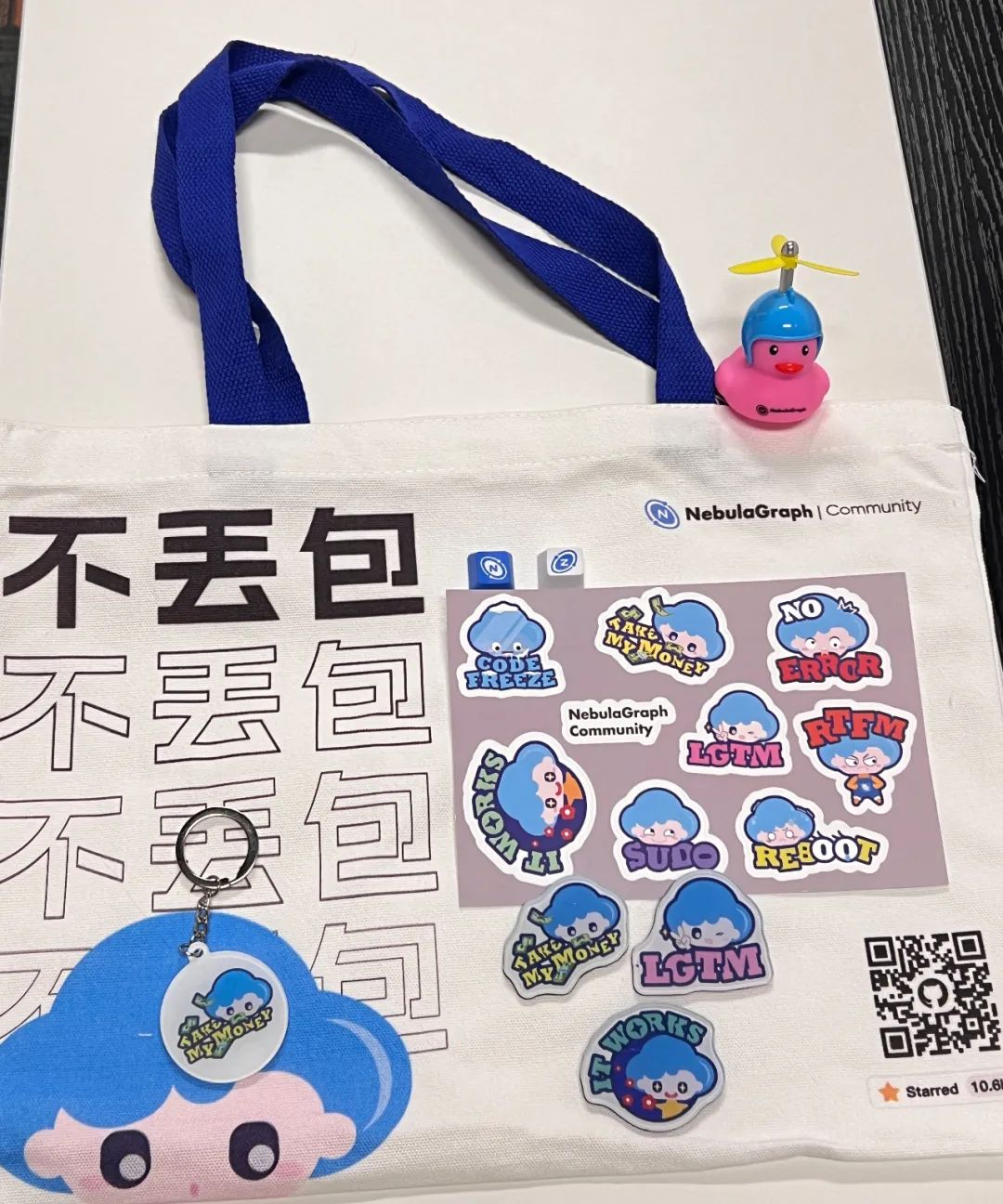 第一名:不丢包+钥匙扣+冰箱贴+星云仔白色 T 恤+键帽*2+ NebulaGraph 专属贴纸*1