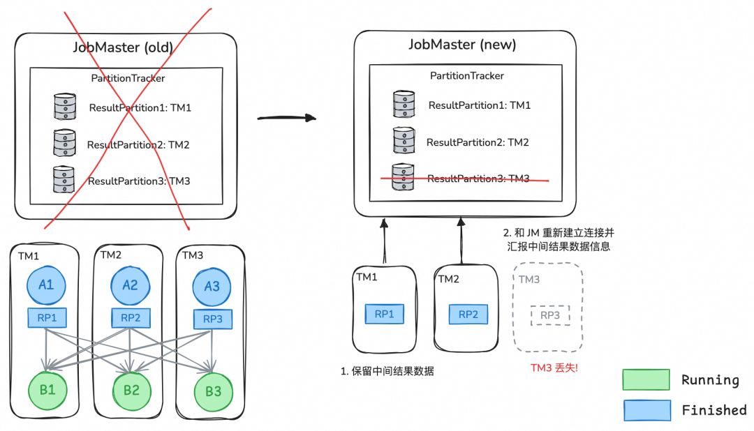 Flink 批作业在运行过程中,其中间结果数据会保存在 TM 上和 RSS 上。当 JM 发生故障时,TM 和 RSS 将保留与作业相关的中间结果数据,并不断地尝试重新连接到 JM。一旦新的 JM 重新被拉起来后,TM 和 RSS 将重新与 JM 建立连接,然后 TM 和 RSS 会主动上报它们持有的中间结果数据。