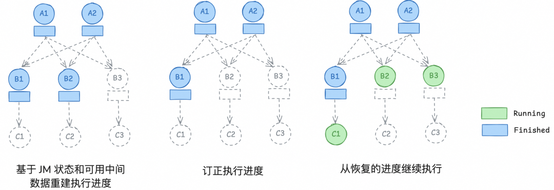 随后,JM 将根据汇报上来的可用中间数据进一步校正执行进度。如果某个 task 产生的中间数据丢失,但这些数据仍被下游 task 所需要,那么该 task 将被重置并重新执行。