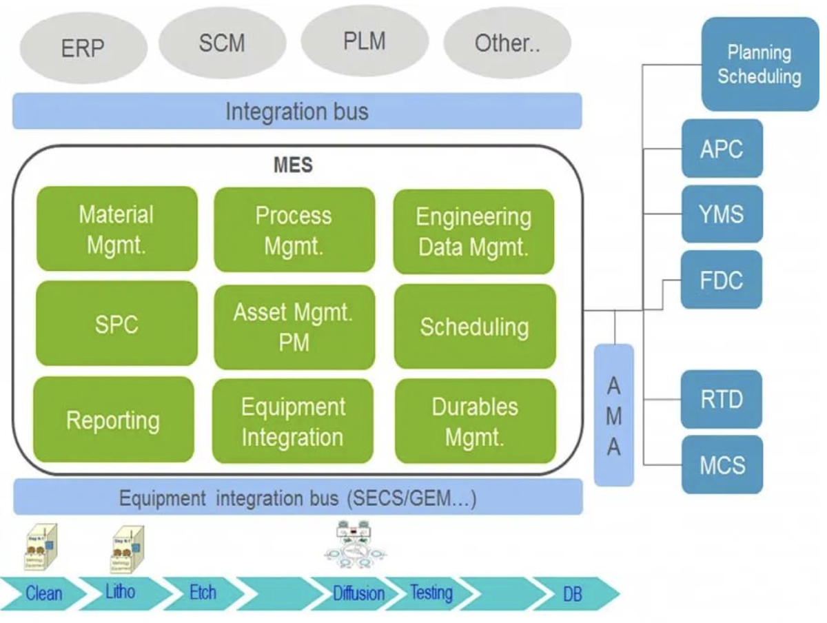 在晶圆厂中,每片晶圆的生产、库存信息都要汇总到MES(Manufacturing Execution System,制造执行系统)中,供操作员、工艺工程师、设备工程师和晶圆厂管理层等晶圆厂工作人员对芯片生产进行查看、管理和调度。简单来说,MES系统就如同晶圆厂的大脑一样。