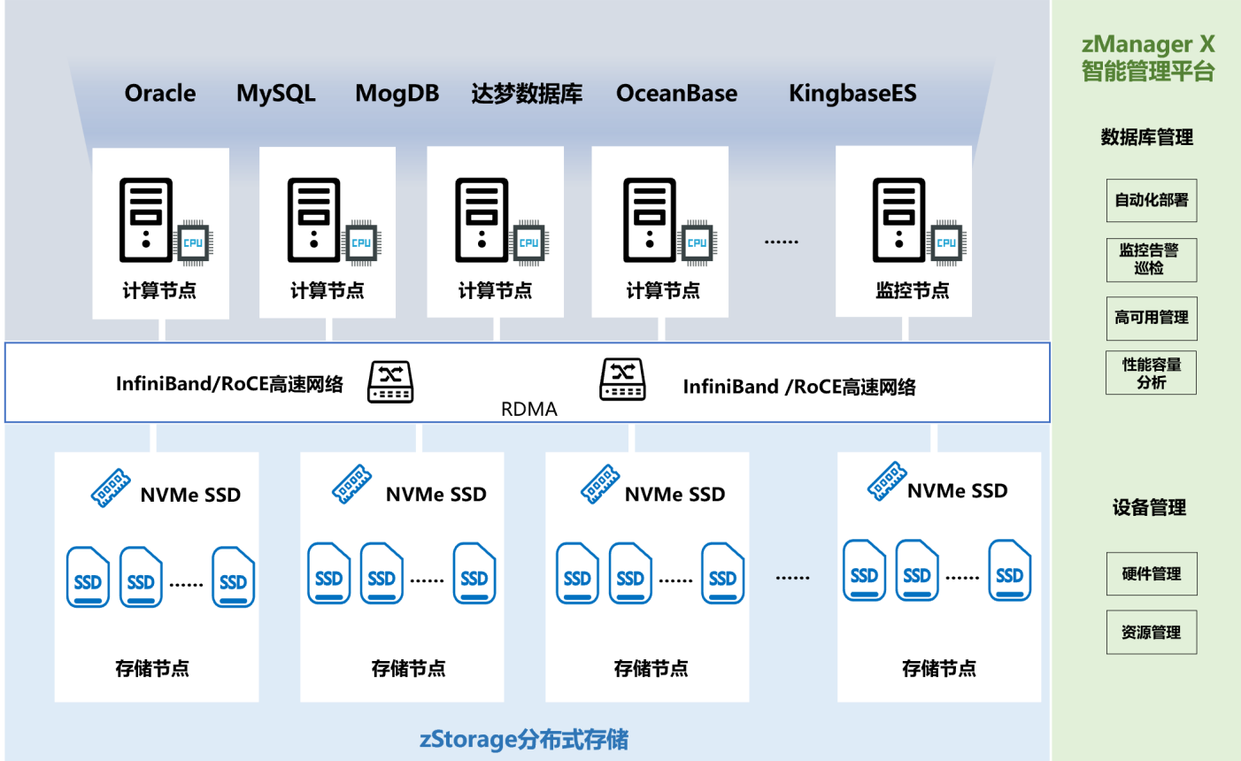 zData X数据库一体机是融合了高性能计算、热插拔闪存、InfiniBand 网络、RDMA 远