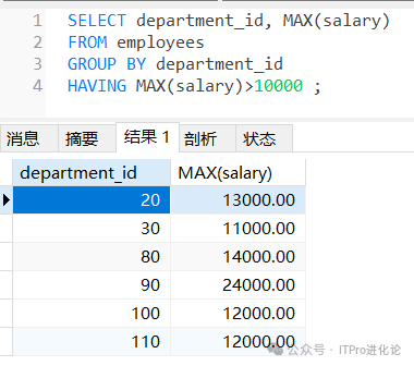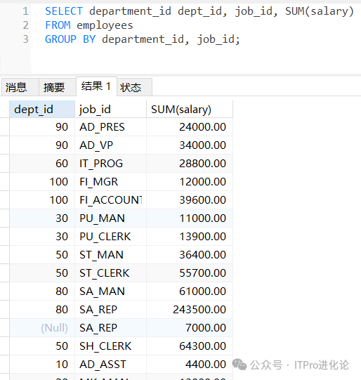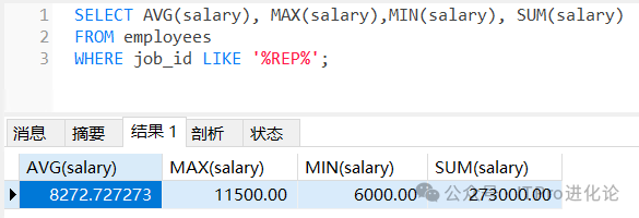示例:查符合条件的工作的平均工资,最高工资,最低工资,工资总和