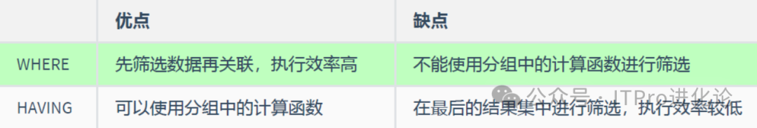 WHERE 可以直接使用表中的字段作为筛选条件,但不能使用分组中的计算函数作为筛选条件;HAVING 必须要与 GROUP BY 配合使用,可以把分组计算的函数和分组字段作为筛选条件。 如果需要通过连接从关联表中获取需要的数据,WHERE 是先筛选后连接,而 HAVING 是先连接后筛选。