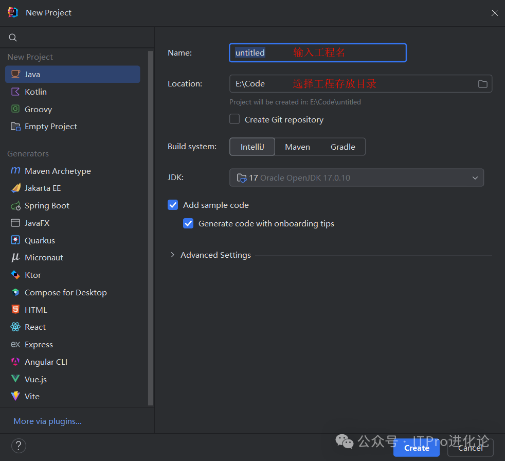 新建工程窗口,输入工程名,选择工程存放目录,点击Create创建工程;
