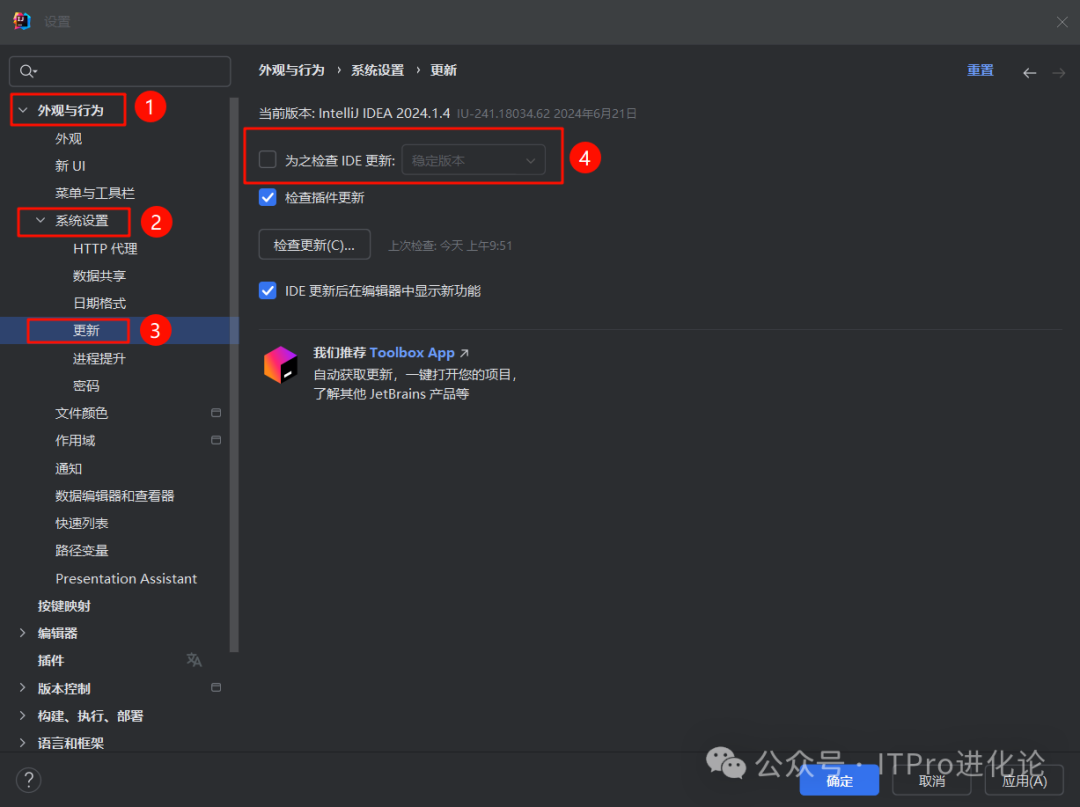 设置——外观与行为——系统设置——更新,去掉为之检查IDE更新