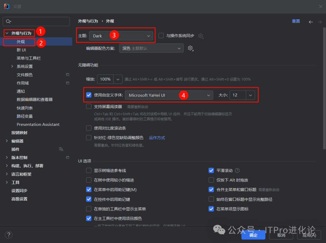 设置——外观与行为——外观,可修改主题,勾选使用自定义字体