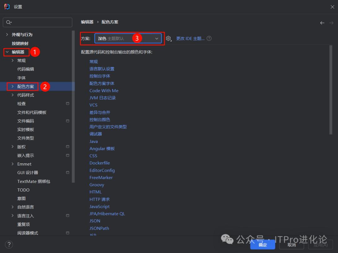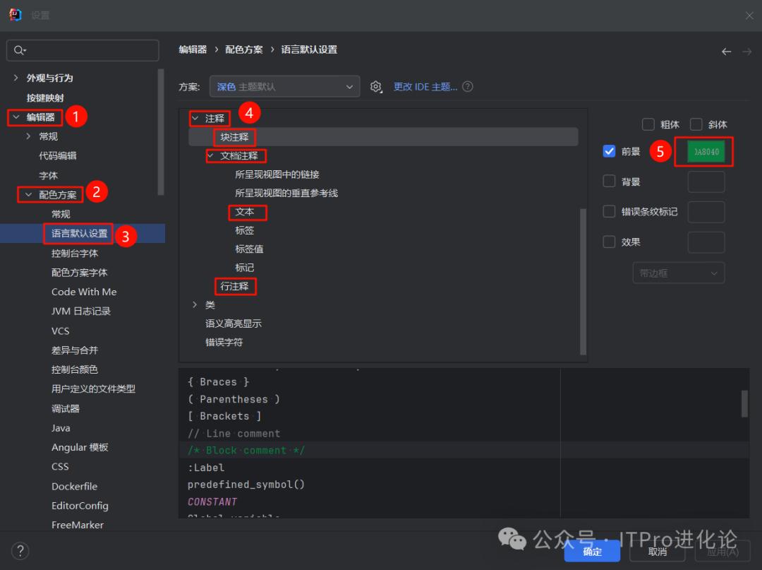 设置——编辑器——配色方案——语言默认设置——注释,修改块注释、文档注释的文本、行注释的文字颜色,设置的颜色是 0A8040