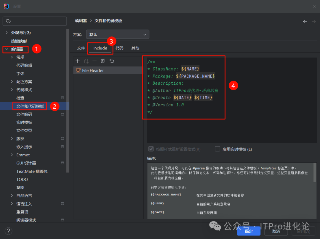 设置——编辑器——文件和代码模板——Include,在右侧窗口填写想要的自动注解;