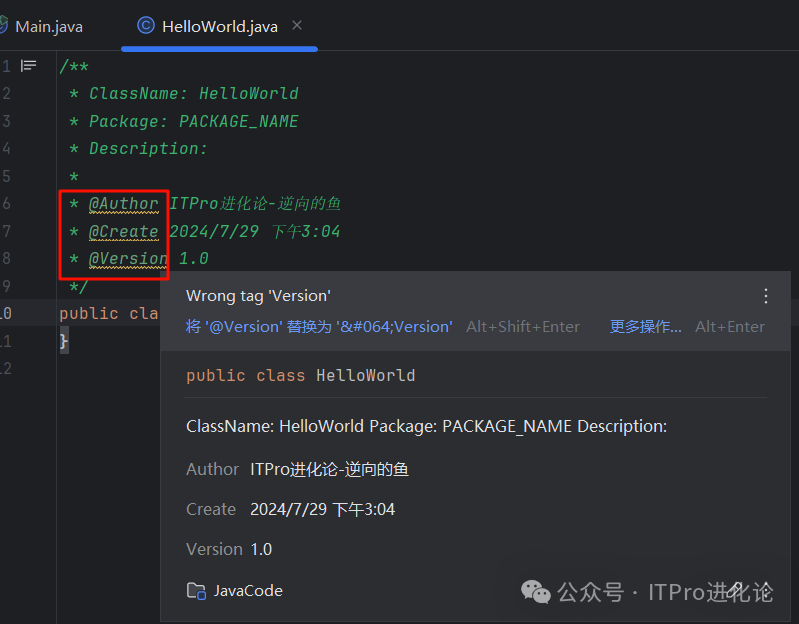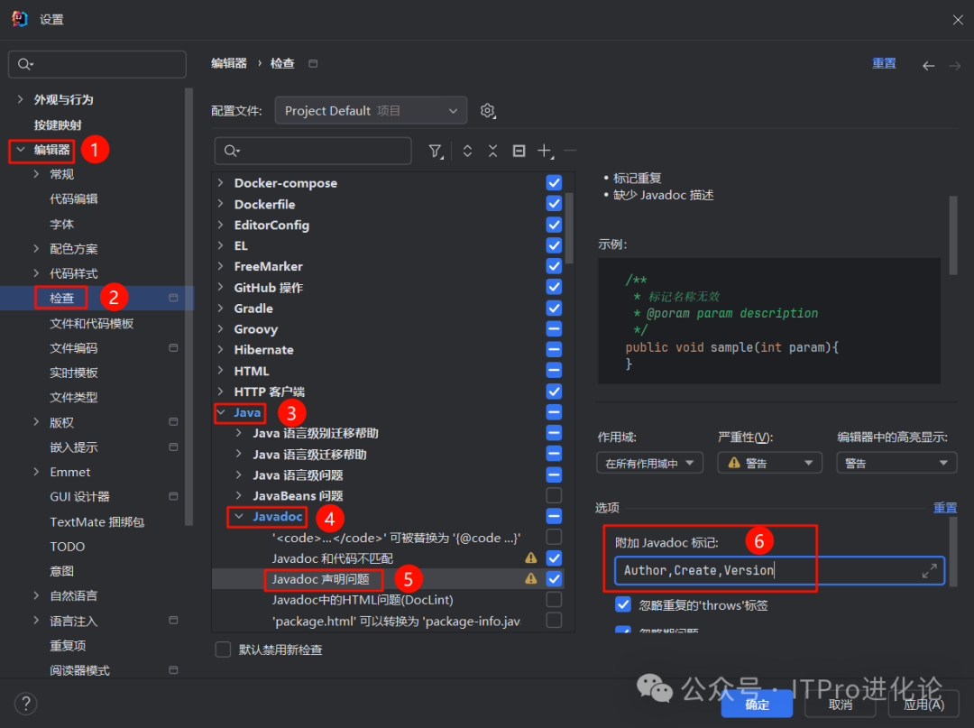 设置——编辑器——检查——Java——Javadoc——Javadoc声明问题——附加Javadoc标记;将Author,Create,Version