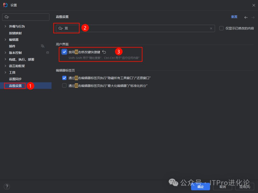 IDEA默认连续按两次shift键,弹出搜索对话框,因按shift键切换中英文输入法,经常按的太快,弹出搜索对话框,所以建议取消双击Shift搜索;