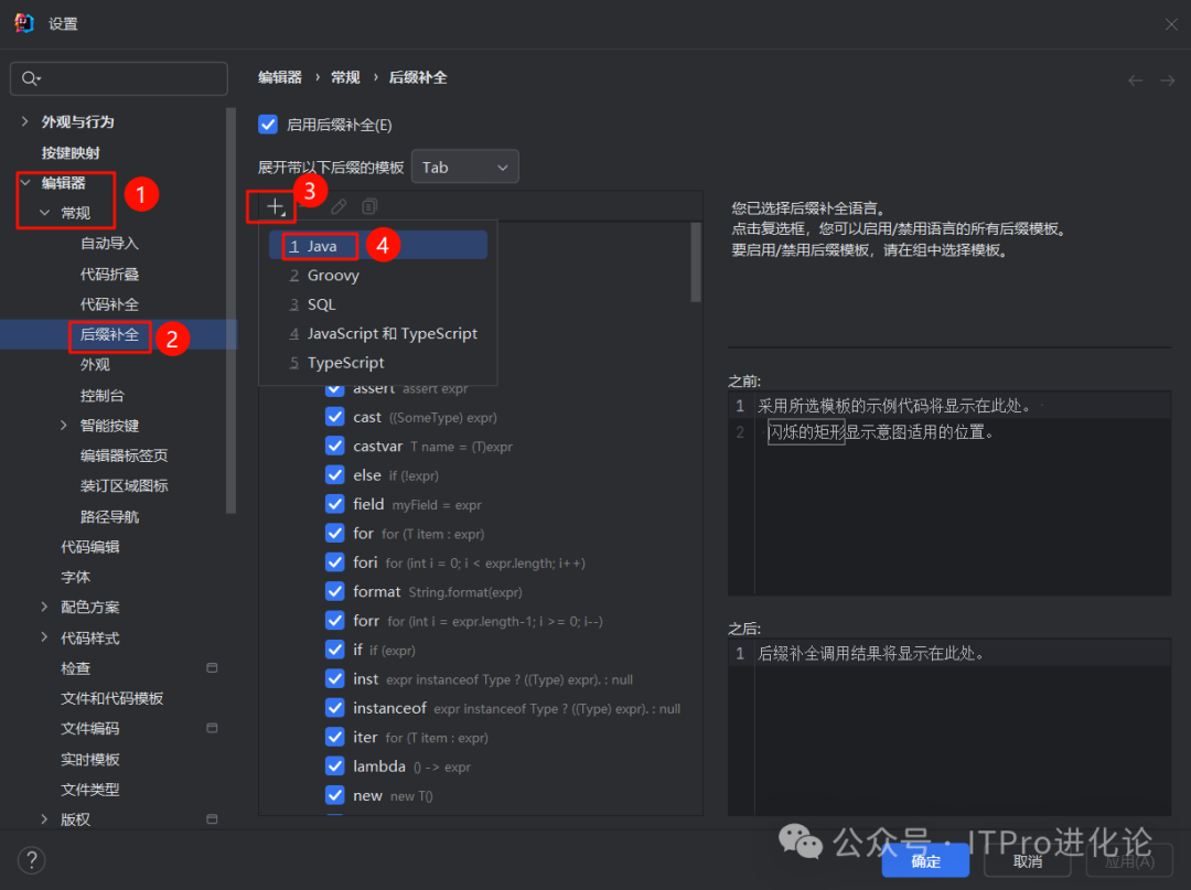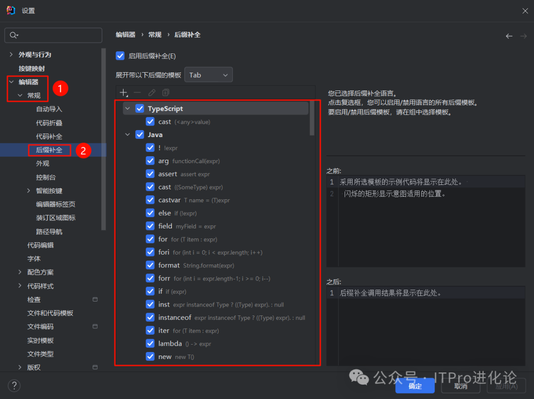 设置——编辑器——常规——后缀补全,这里可以查看后缀补全的模板;
