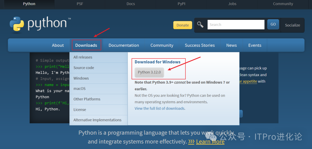 在主页上方导航栏,鼠标移动到Download上面,弹出页面,点击右侧Download for Windows下的Python 3.12.0进行下载;
