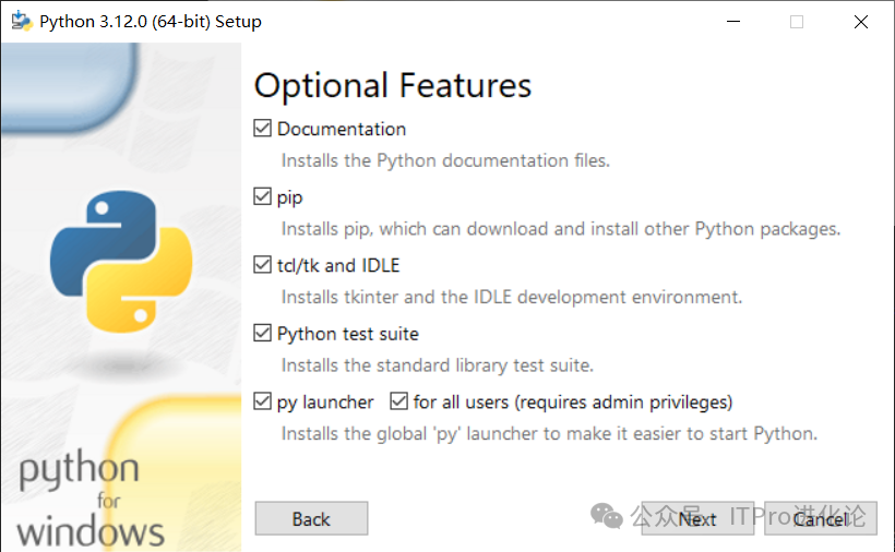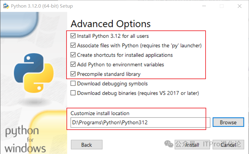Install Python 3.12 for all users:为所有用户安装Python 3.12; Associate files with Python (requires the 'py' launcher):将文件与Python关联(需要‘py’启动器); Create shortcuts for installed applications:为已安装的应用程序创建快捷方式; Add Python to environment variables:添加Python安装路径到环境变量; Precompile standard library:预编译标准库;