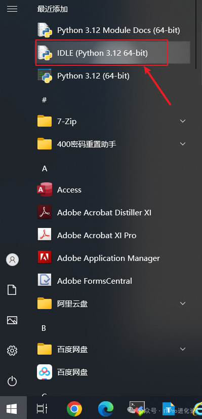 点击开始菜单,在最近添加里找到IDLE(Python 3.12 64-bit),点击运行;