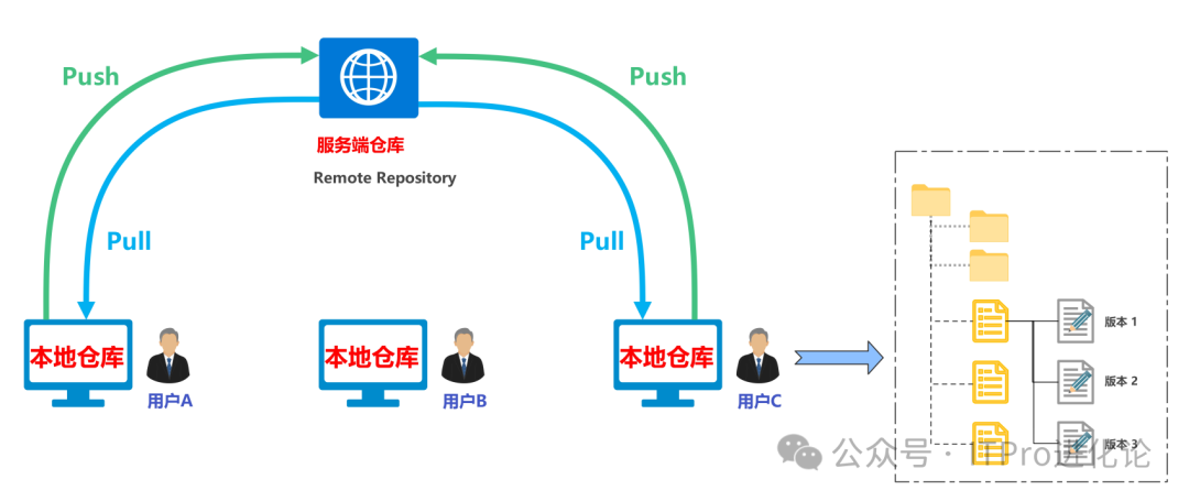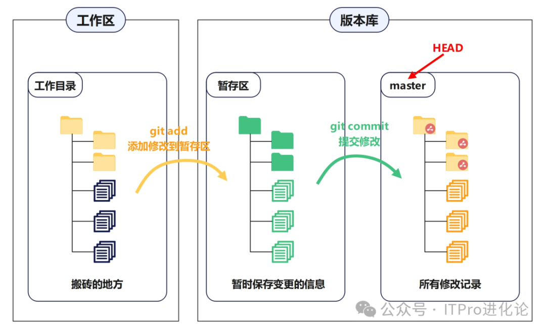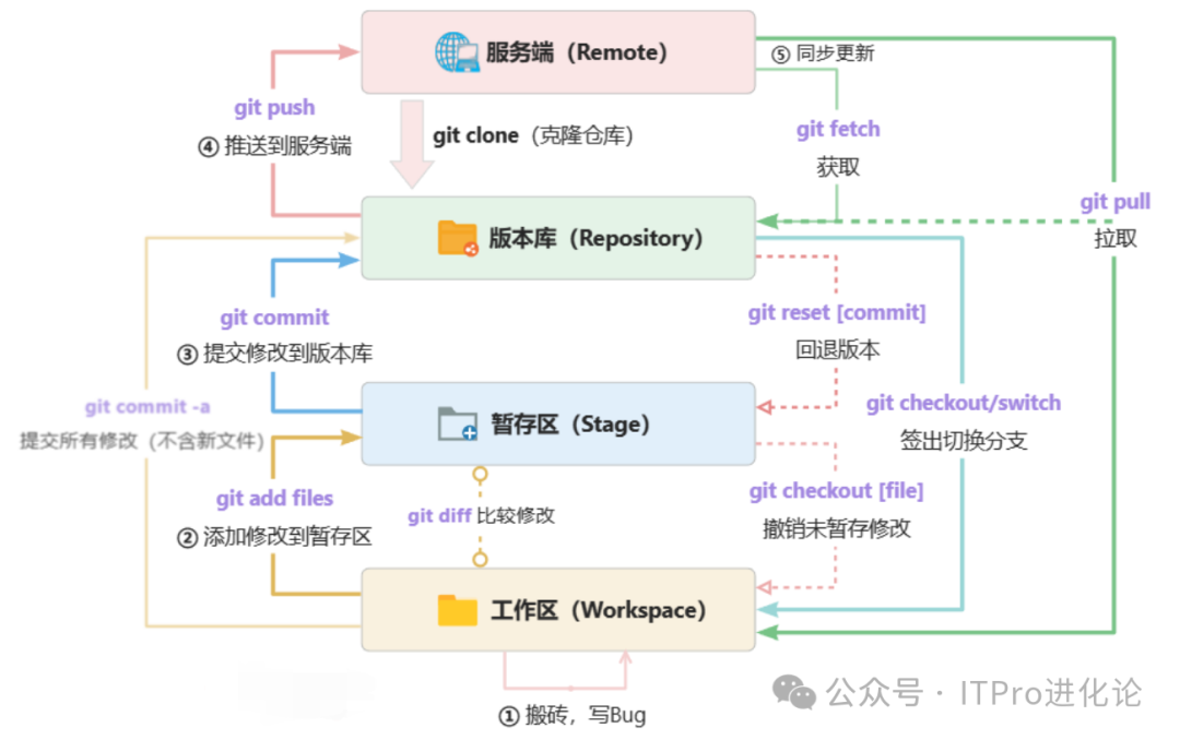 0、准备仓库:创建或从服务端克隆一个仓库。 1、搬砖:在工作目录中添加、修改代码。 2、暂存(git add):将需要进行版本管理的文件放入暂存区域。 3、提交(git commit):将暂存区域的文件提交到Git仓库。 4、推送(git push):将本地仓库推送到远程仓库,同步版本库。 5、获取更新(fetch/pull):从服务端更新到本地,获取他人推送的更新,与他人协作、共享。