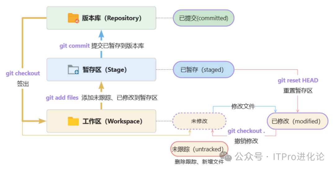 未跟踪(untracked):新添加的文件,或被移除跟踪的文件,未建立跟踪,通过git add添加暂存并建立跟踪。 未修改:从仓库签出的文件默认状态,修改后就是“已修改”状态了。 已修改(modified):文件被修改后的状态。 已暂存(staged):修改、新增的文件添加到暂存区后的状态。 已提交(committed):从暂存区提交到版本库。