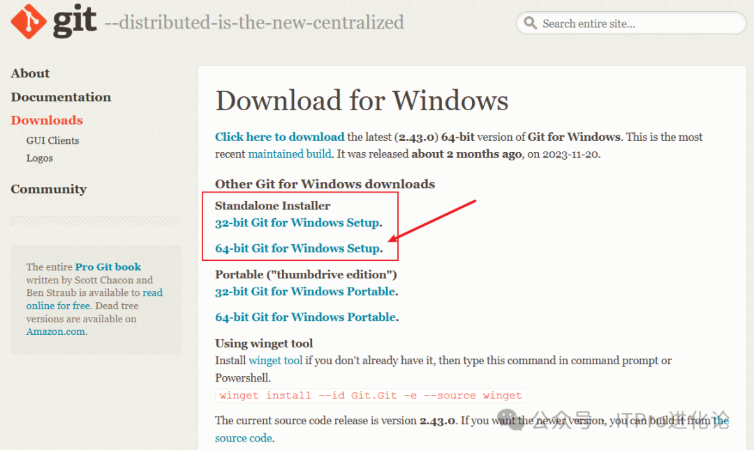 打开Git下载地址,网站会根据当前电脑的操作系统,推荐对应版本的下载信息,可直接点击右侧推荐的下载按钮,也可点击左侧菜单下载不同操作系统的安装程序;