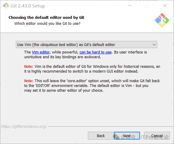 选择Git的默认编辑,默认Vim编辑器,直接点击Next即可;
