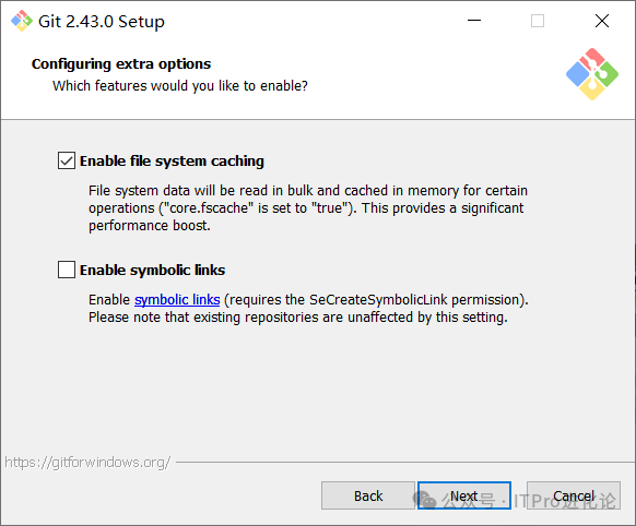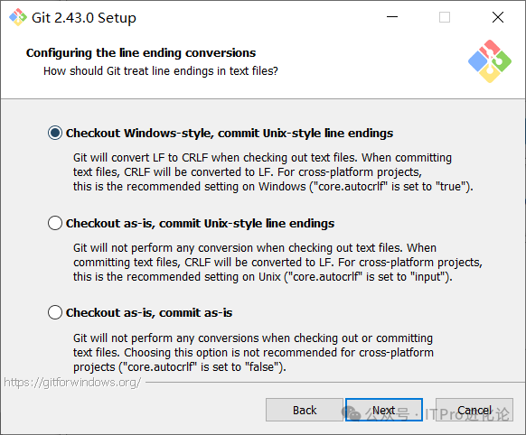 配置 Git 文件的行末换行符,Windows 使用 CRLF,Linux 使用 LF,保持默认选项,直接点击Next;