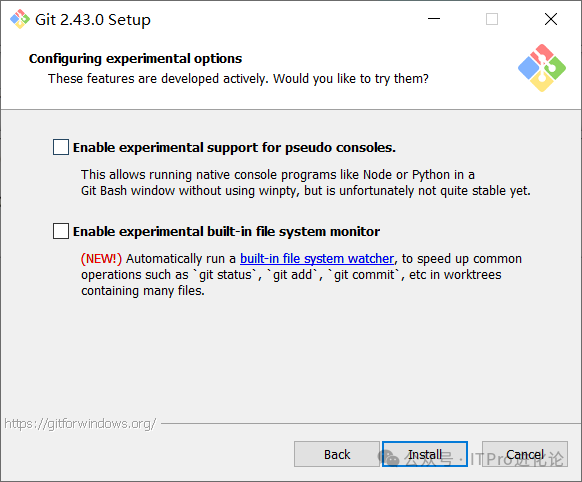 配置实验选项,这里也保持默认即可,点击Install进行安装;