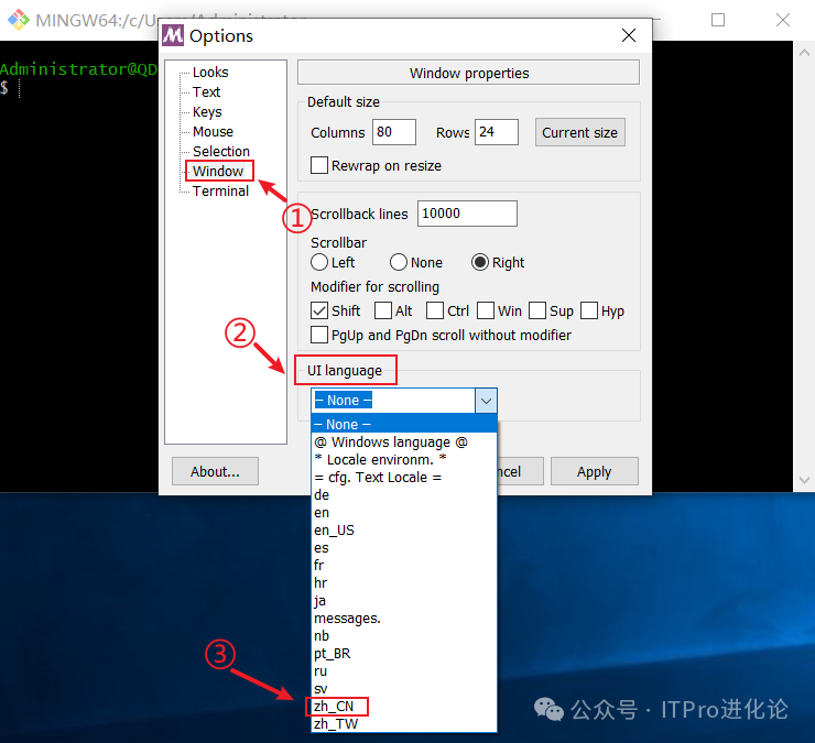 Options中点击Window,找到UI language,在下拉菜单中选择zh_CN,点击save保存,即可修改为中文;