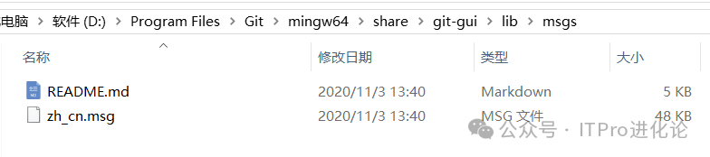 在D:\Program Files\Git\mingw64\share\git-gui\lib目录下创建msgs目录,将zh_cn.msg和README.md复制到msgs目录中;